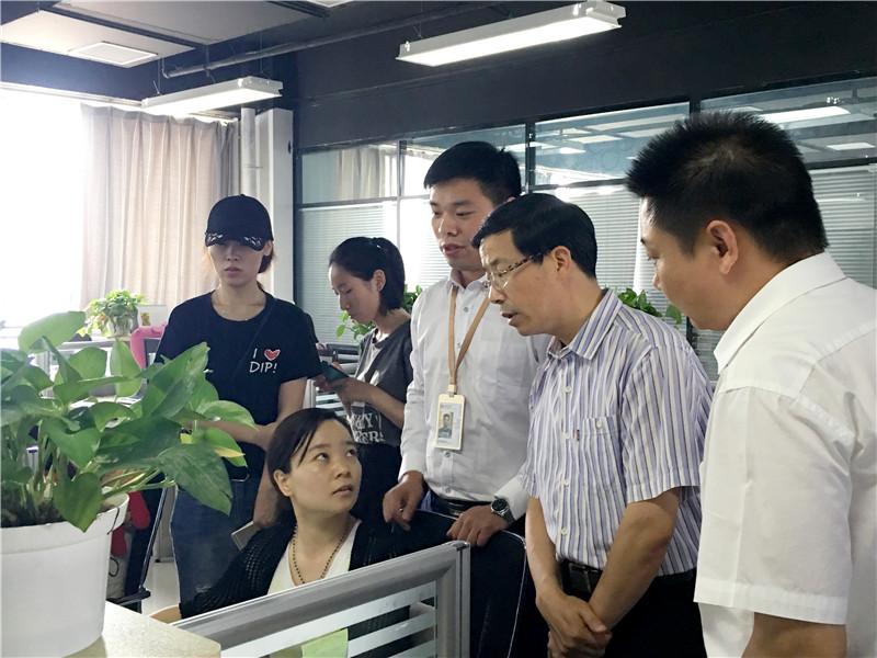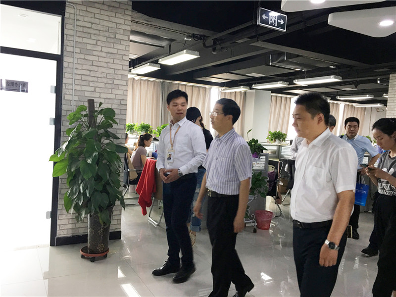 星空总部,我公司人资总监与业务主管陪同万副市长及各位领导一同参观公司内部,并且将介绍了公司各部门职能与工作内容。